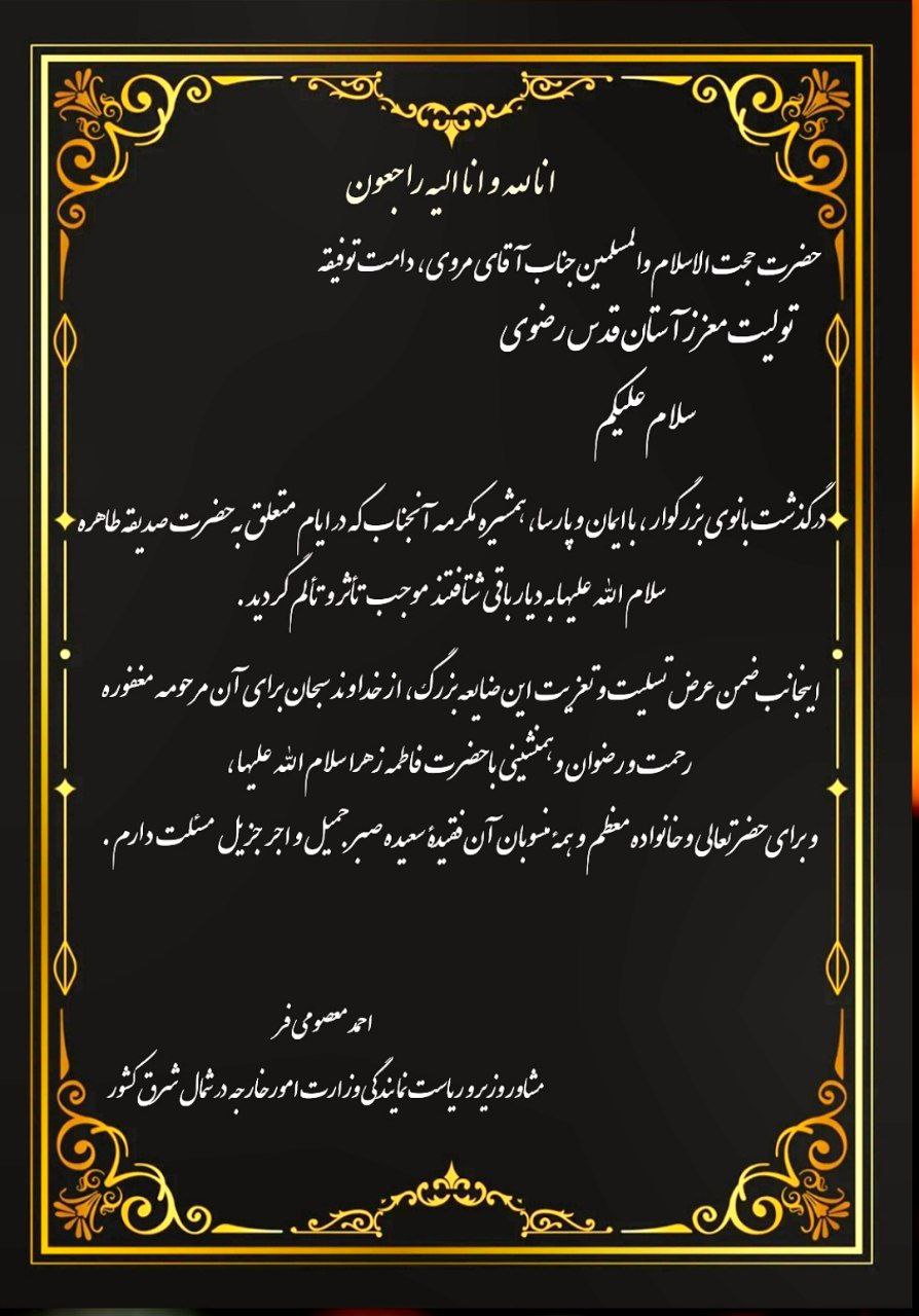 ◾️پیام تسلیت ریاست نمایندگی وزارت امورخارجه به مناسبت درگذشت خواهر گرامی حجت‌الاسلام والمسلمین آقای مروی تولیت محترم آستانقدس رضوی.. 🏴